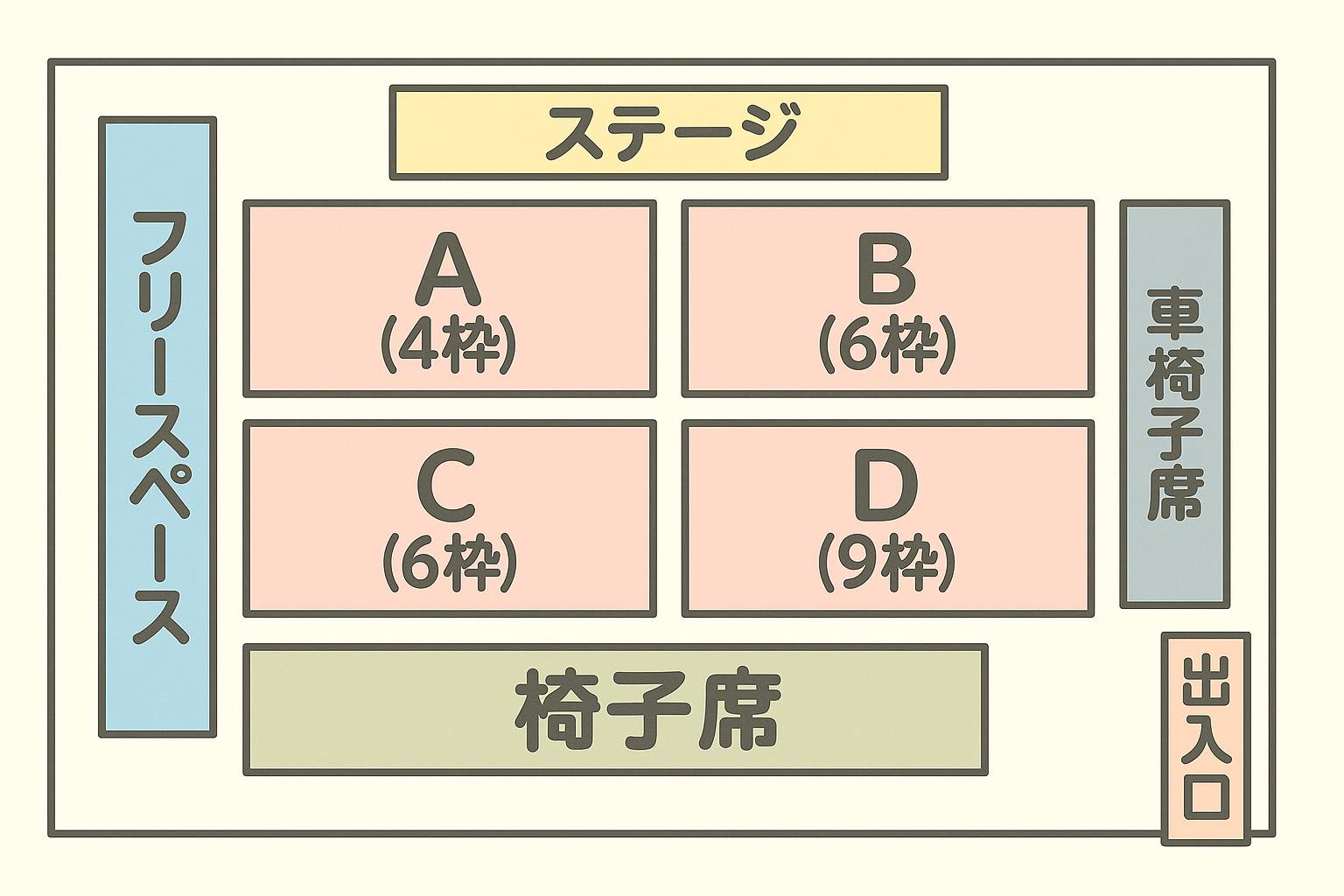 | 座席 | レジャーシート席:25枠 車椅子席:6枠 ※レジャーシート席はご希望のエリアを選べます。下記参照