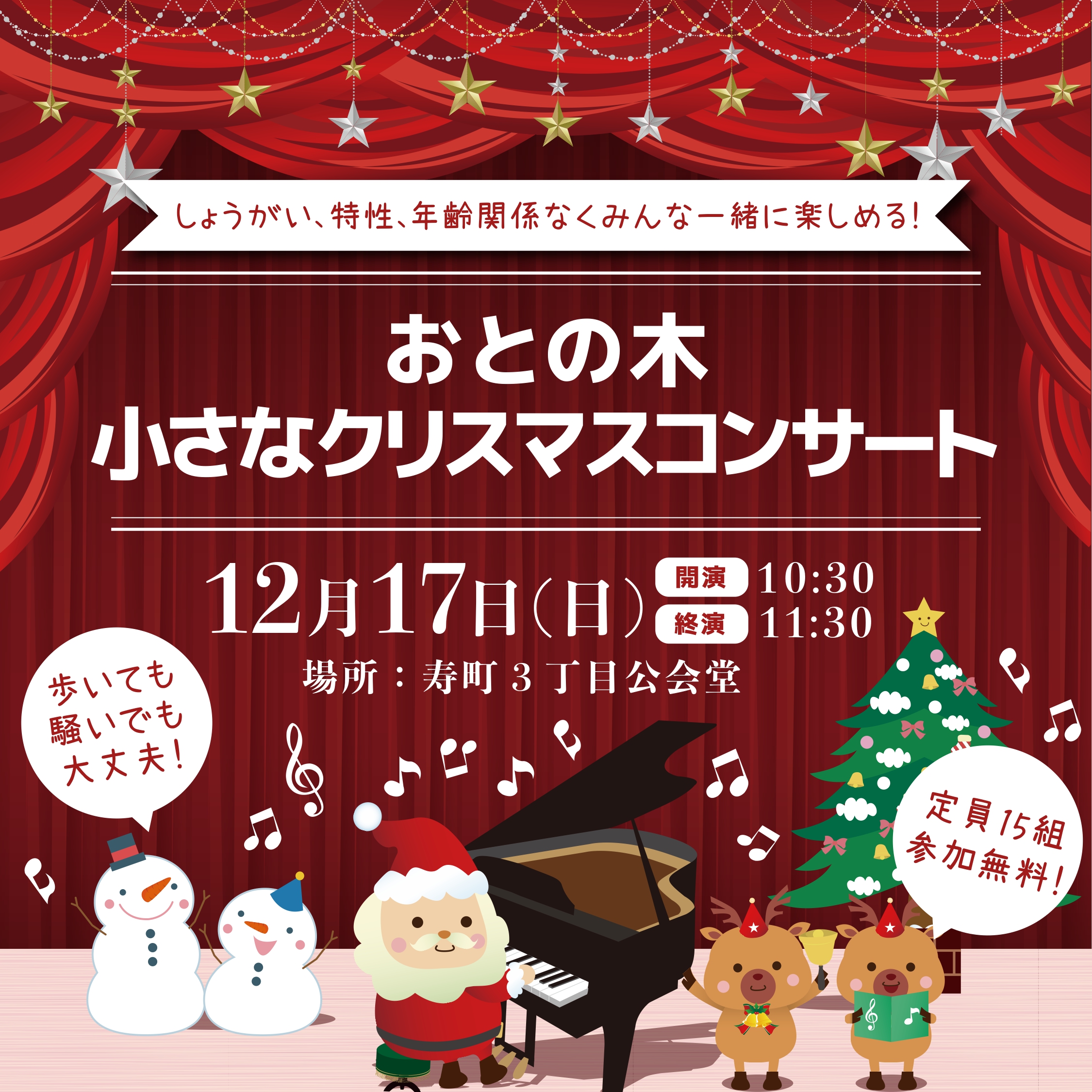 2023年12月17日、東京都府中市の「寿町三丁目公会堂」にて「おとの木小さなクリスマスコンサート」を開催しました。